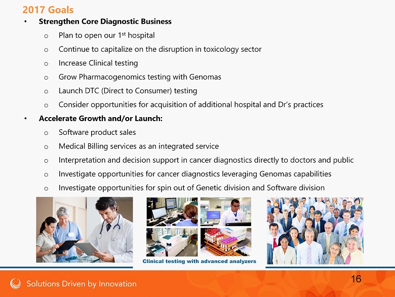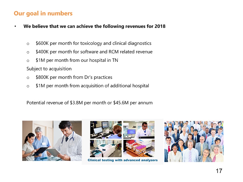• Strengthen Core Diagnostic Business o Plan to o pen our 1 st hospital o Continue to capitalize on the disruption in toxicology sector o Increase Clinical testing o Grow Pharmacogenomics testing with Genomas o Launch DTC (Direct to Consumer) testing o Consider opportunities for acquisition of additional hospital and Dr’s practices • Accelerate Growth and/or Launch: o Software product sales o Medical Billing services as an integrated service o Interpretation and decision support in cancer diagnostics directly to doctors and public o Investigate opportunities for cancer diagnostics leveraging Genomas capabilities o Investigate opportunities for spin out of Genetic division and Software division 16 2017 Goals