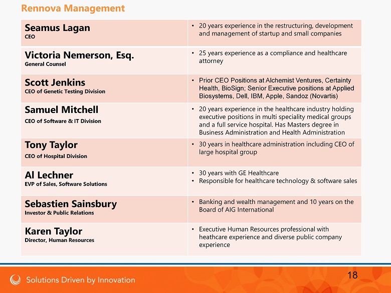 Seamus Lagan CEO • 20 years experience in the restructuring, development and management of startup and small companies Victoria Nemerson, Esq. General Counsel • 25 years experience as a compliance and healthcare attorney Scott Jenkins CEO of Genetic Testing Division • Prior CEO Positions at Alchemist Ventures, Certainty Health, BioSign ; Senior Executive positions at Applied Biosystems, Dell, IBM, Apple, Sandoz (Novartis) Samuel Mitchell CEO of Software & IT Division • 20 years experience in the healthcare industry holding executive positions in multi speciality medical groups and a full service hospital. Has Masters degree in Business Administration and Health Administration Tony Taylor CEO of Hospital Division • 30 years in healthcare administration including CEO of large hospital group Al Lechner EVP of Sales, Software Solutions • 30 years with GE Healthcare • Responsible for healthcare technology & software sales Sebastien Sainsbury Investor & Public Relations • Banking and wealth management and 10 years on the Board of AIG International Karen Taylor Director, Human Resources • Executive Human Resources professional with heathcare experience and diverse public company experience 18 Rennova Management