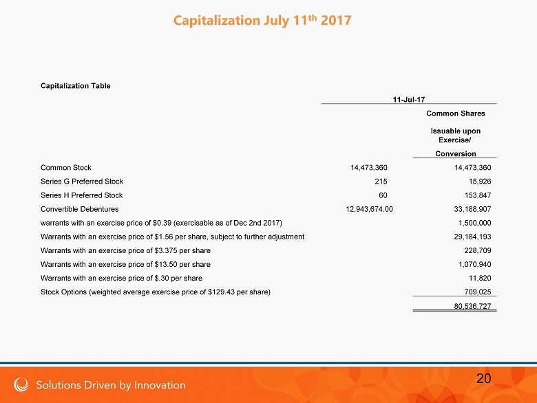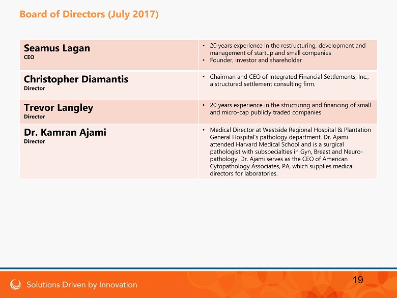 Seamus Lagan CEO • 20 years experience in the restructuring, development and management of startup and small companies • Founder, investor and shareholder Christopher Diamantis Director • Chairman and CEO of Integrated Financial Settlements, Inc., a structured settlement consulting firm. Trevor Langley Director • 20 years experience in the structuring and financing of small and micro - cap publicly traded companies Dr. Kamran Ajami Director • Medical Director at Westside Regional Hospital & Plantation General Hospital’s pathology department. Dr. Ajami attended Harvard Medical School and is a surgical pathologist with subspecialties in Gyn , Breast and Neuro - pathology. Dr. Ajami serves as the CEO of American Cytopathology Associates, PA, which supplies medical directors for laboratories. 19 Board of Directors (July 2017)