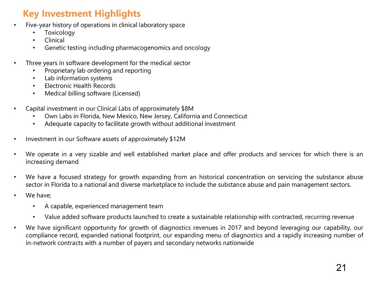 • Five - year history of operations in clinical laboratory space • Toxicology • Clinical • Genetic testing including pharmacogenomics and oncology • Three years in software development for the medical sector • Proprietary lab ordering and reporting • Lab information systems • Electronic Health Records • Medical billing software (Licensed) • Capital investment in our Clinical Labs of approximately $ 8 M • Own Labs in Florida, New Mexico, New Jersey, California and Connecticut • Adequate capacity to facilitate growth without additional investment • Investment in our Software assets of approximately $ 12 M • We operate in a very sizable and well established market place and offer products and services for which there is an increasing demand • We have a focused strategy for growth expanding from an historical concentration on servicing the substance abuse sector in Florida to a national and diverse marketplace to include the substance abuse and pain management sectors . • We have ; • A capable, experienced management team • Value added software products launched to create a sustainable relationship with contracted, recurring revenue • We have significant opportunity for growth of diagnostics revenues in 2017 and beyond leveraging our capability, our compliance record, expanded national footprint, our expanding menu of diagnostics and a rapidly increasing number of in - network contracts with a number of payers and secondary networks nationwide 21 Key Investment Highlights